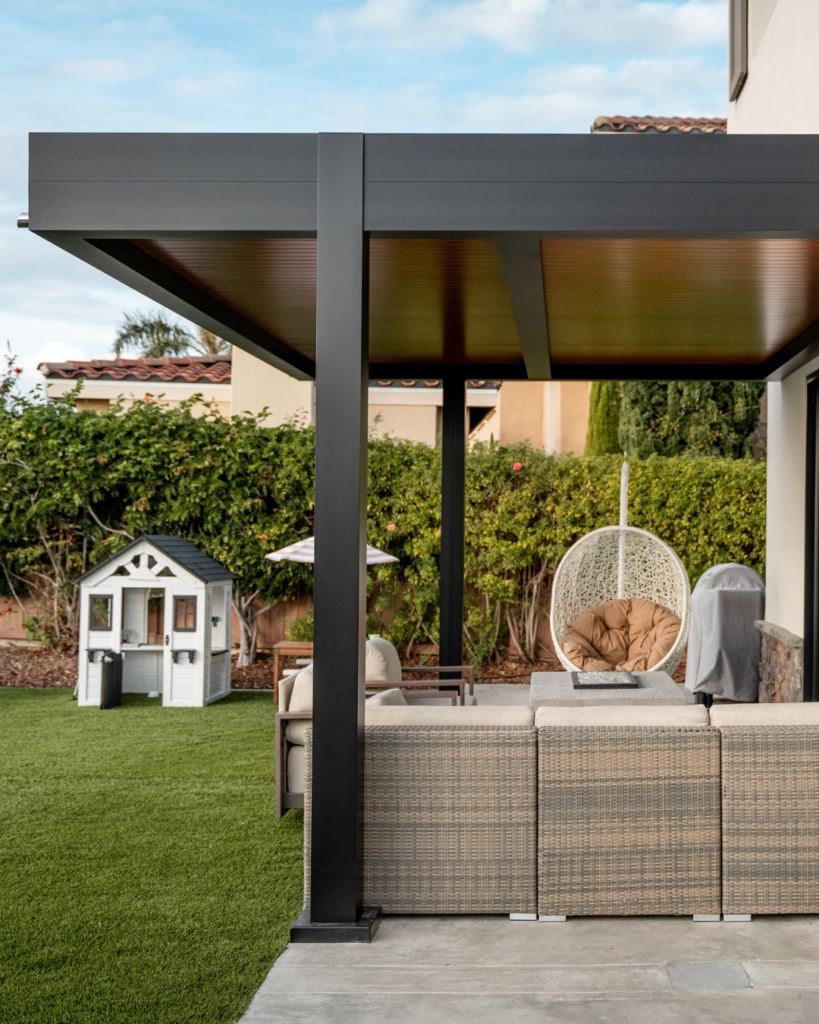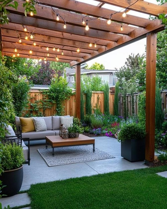 The combination of solid concrete flooring and a wooden pergola feels balanced and inviting.