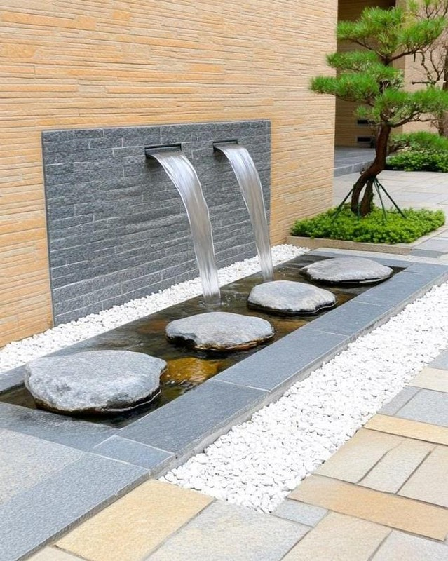 A small fountain or reflecting pool on a concrete patio creates soothing background sound and a relaxing atmosphere. The contrast between water and concrete adds visual interest too.