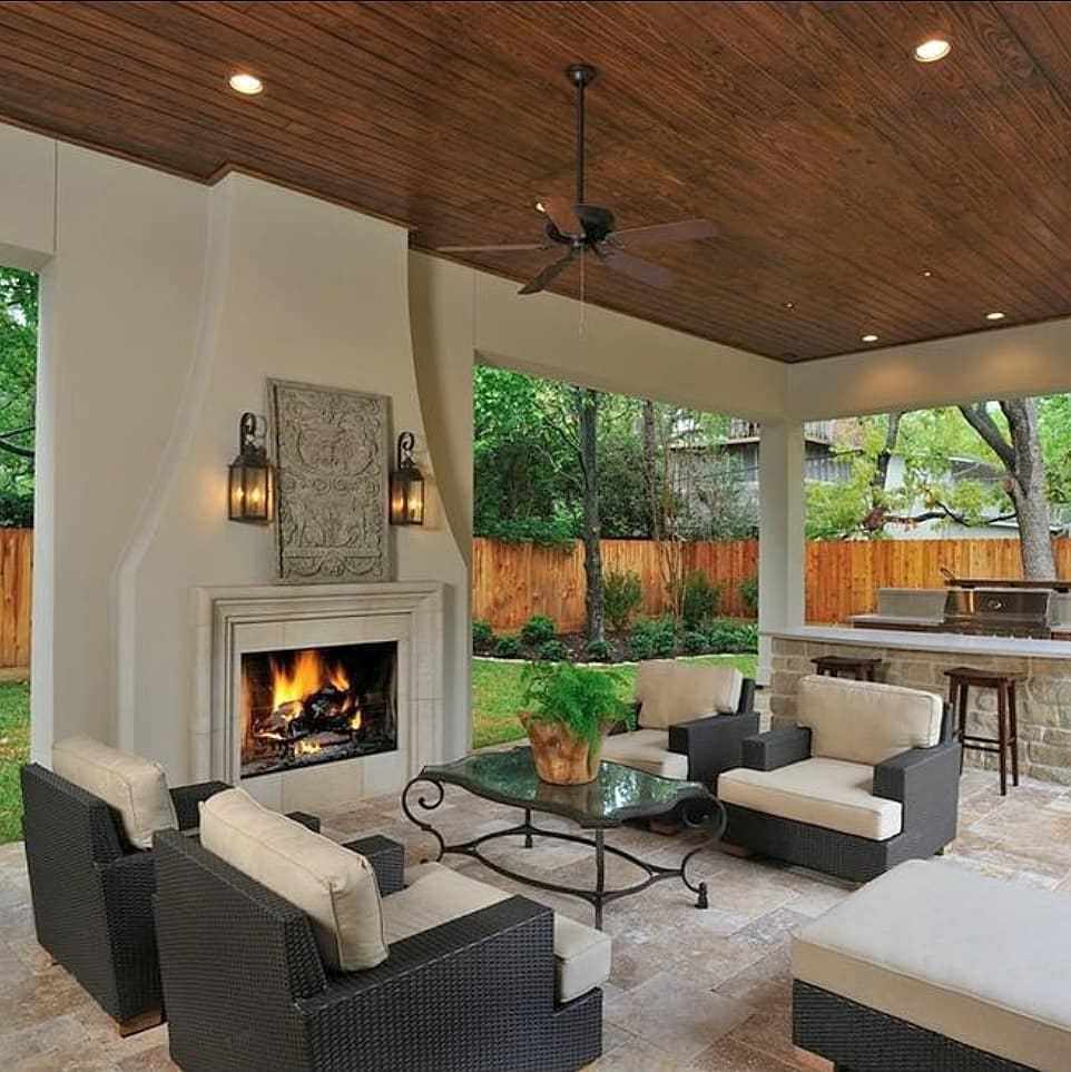 Think exposed wooden beams, cozy furniture, and vintage-style lighting. Add a big farmhouse table and you’ll have the perfect spot for outdoor dinners.