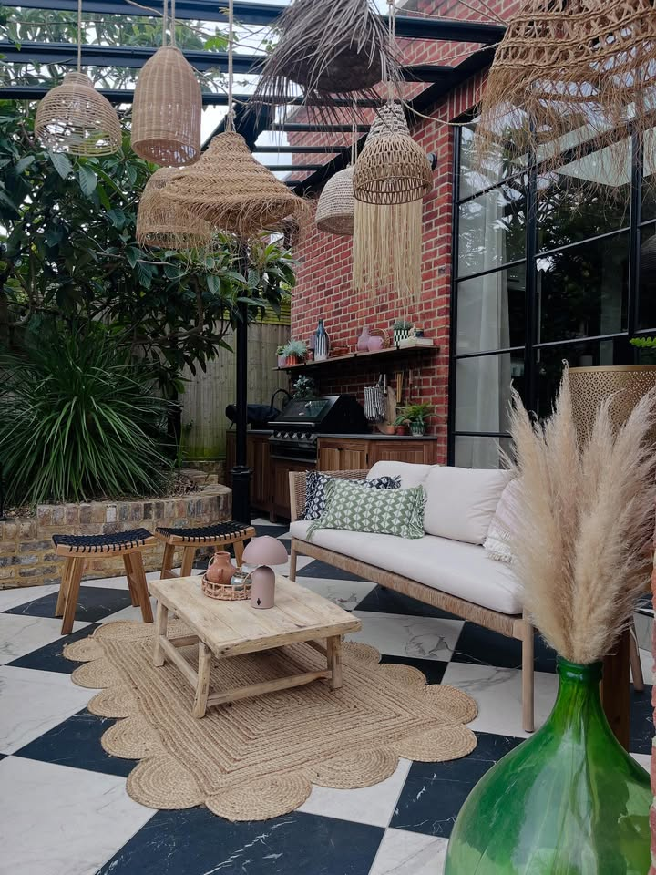 Layer colorful rugs, add floor cushions, lanterns, and woven decor pieces. Under a covered patio, this style feels cozy and artistic.