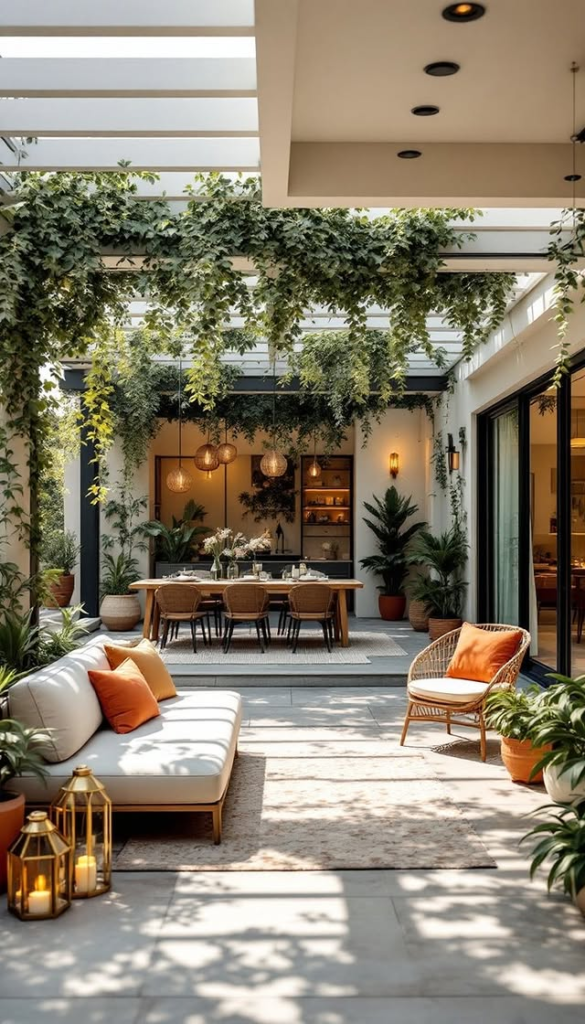 Hang plants from the patio cover, add vertical gardens, and surround the space with greenery. It feels peaceful, fresh, and incredibly relaxing.