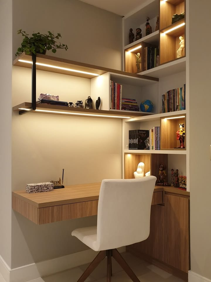 Sometimes less really is more. A simple floating shelf at desk height, paired with a sleek chair and a lamp, can act as a minimalist desk.