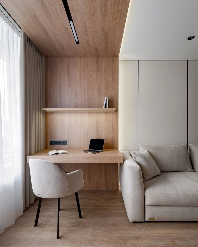 Pair it with a neutral rug and subtle lighting, and your living room office corner feels calm, airy, and inspiring.