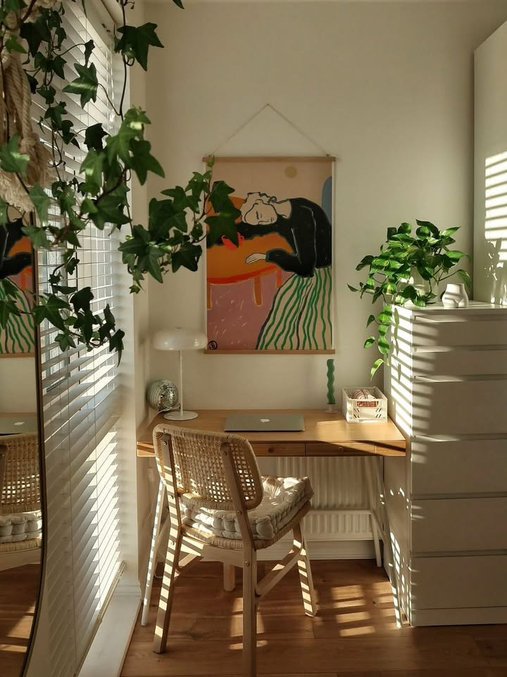 Scandinavian design is all about simplicity, light tones, and functional elegance. Think clean-lined desks, soft wood, minimal accessories, and a comfy chair.