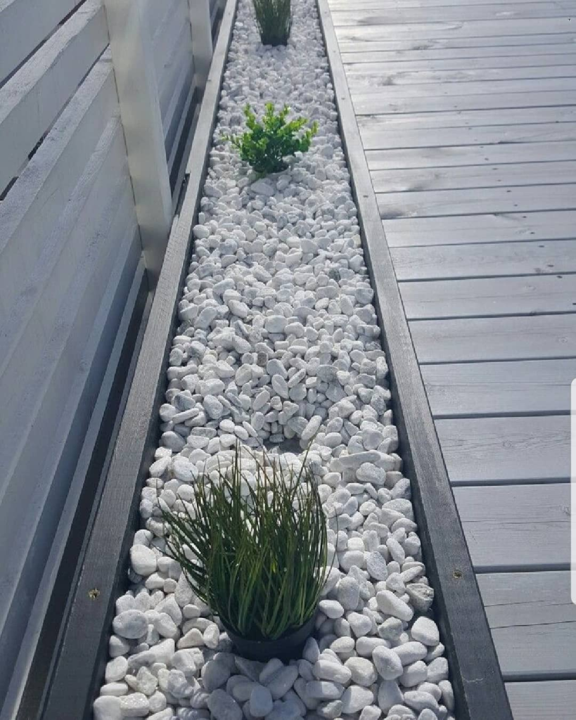 Pebbles are easy to maintain and come in all sorts of shapes, sizes, and colors. You can even mix two colors for a more playful design.