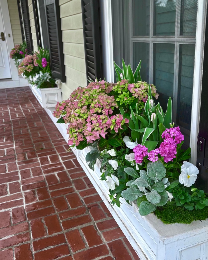 Marigolds, petunias, or pansies pop against the brick, creating a dynamic and inviting look.