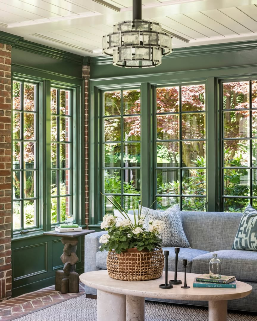 I love this option because it feels like you’re sitting outside while actually being inside. Add comfy chairs, indoor plants, and a coffee table to create a relaxing lounge.