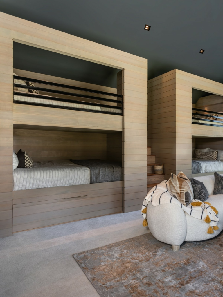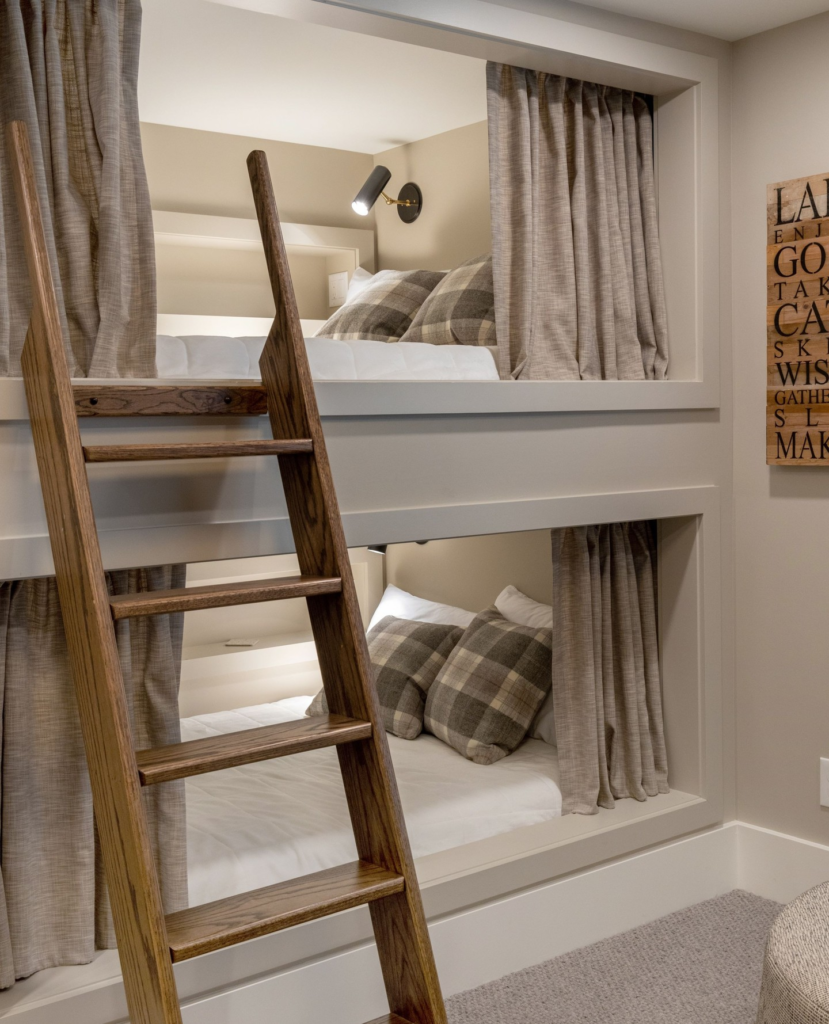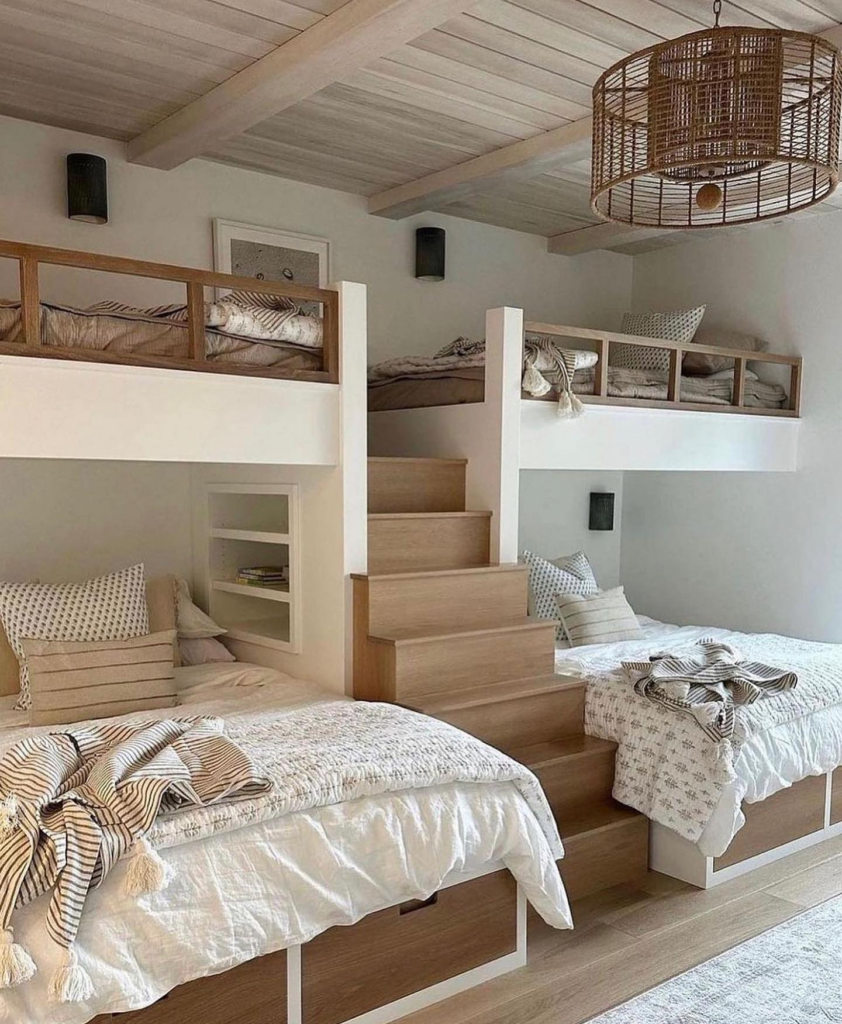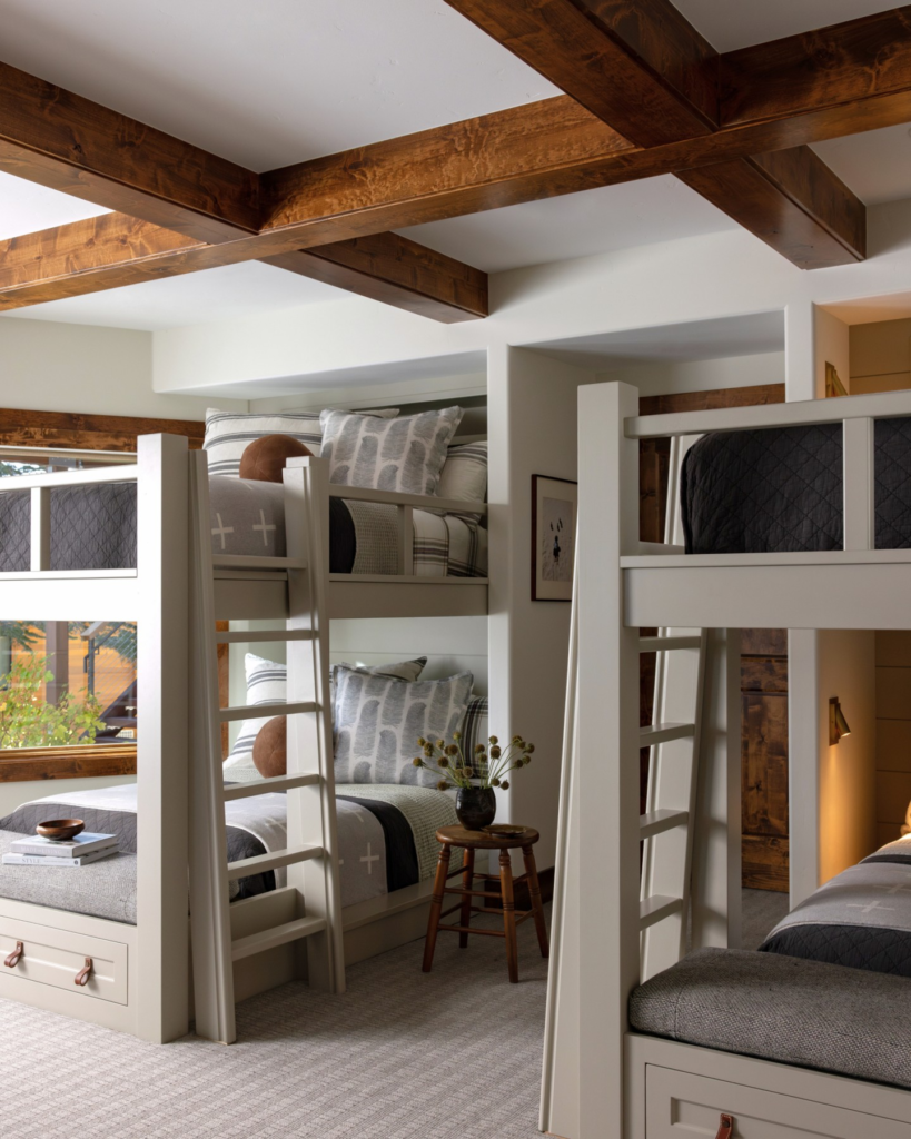 Picture four, six, or even eight beds built into one wall. It creates a fun “camp-style” sleeping area that cousins will absolutely love.