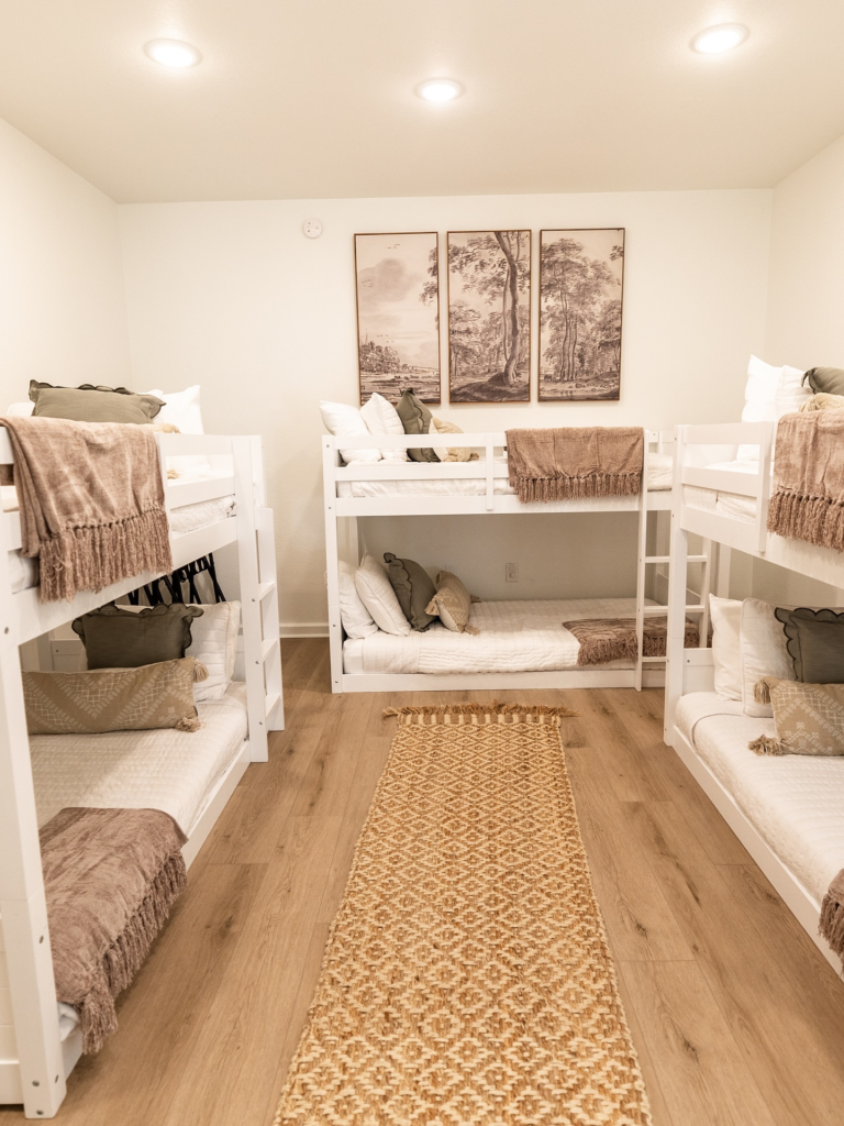 Bunk rooms can feel busy with all the beds, so adding a large soft rug helps ground the space.