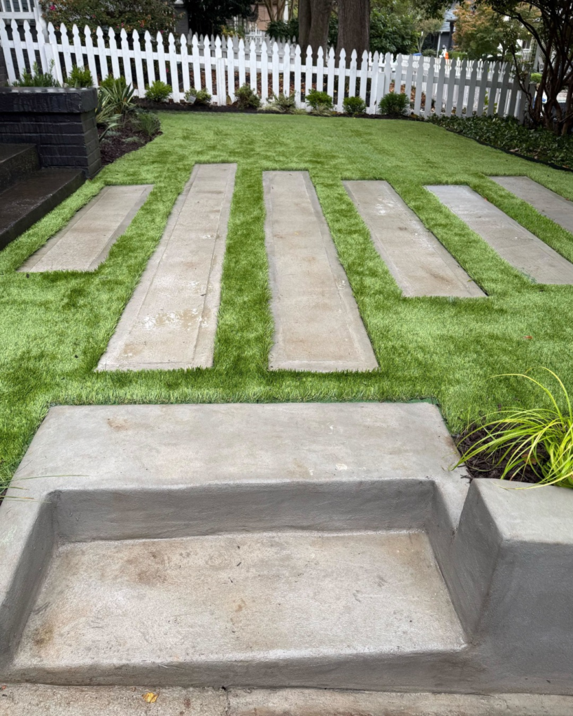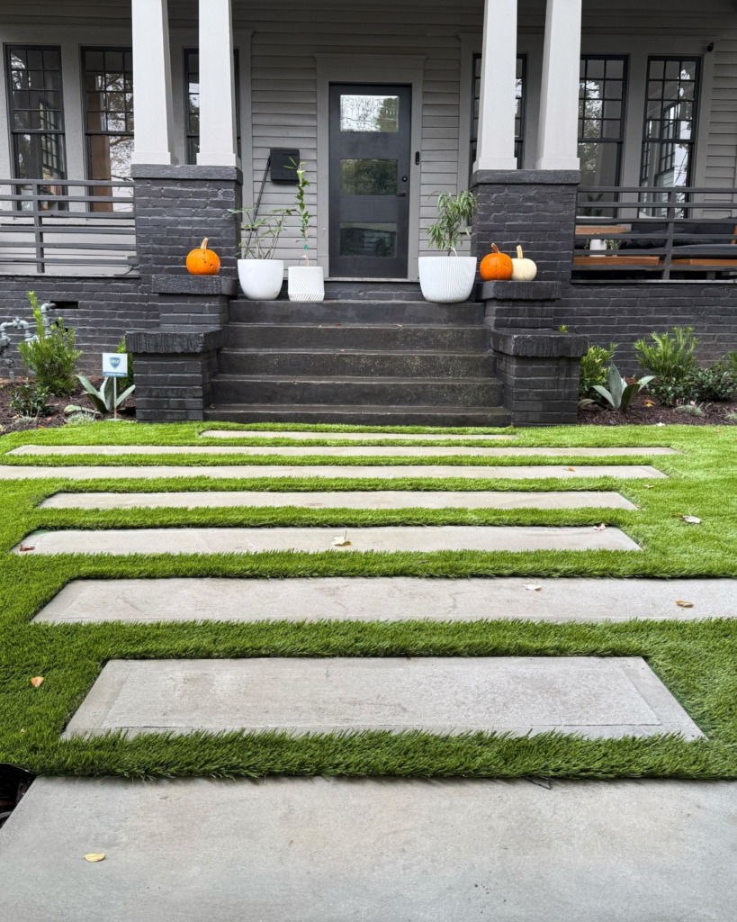 It’s not just visually appealing but also practical the turf softens the area for play while still maintaining a clean walking path.