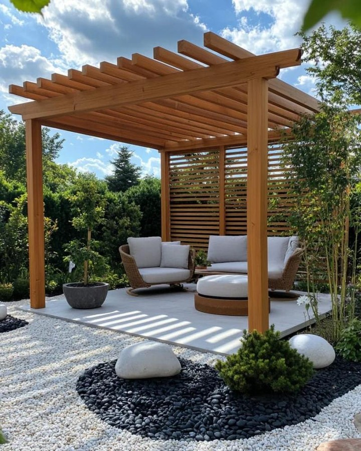 For a sleeker look, consider a minimalist pergola with clean lines and metal or composite materials.