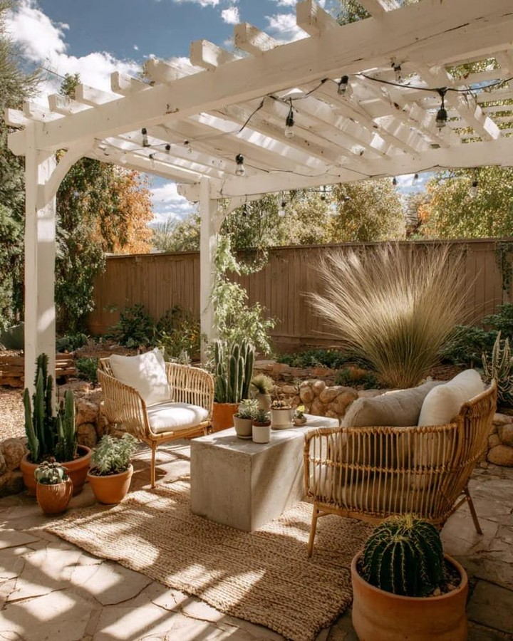 This setup encourages intimate conversations and gives your pergola a casual, relaxed vibe that invites lingering.