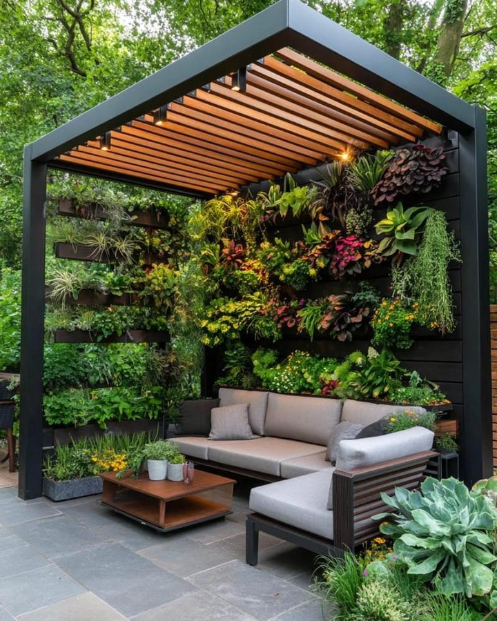 Turn your pergola into a green wall! Attach vertical planters to the sides and fill them with herbs, flowers, or trailing vines. It’s a stunning, space-saving way to bring nature closer.