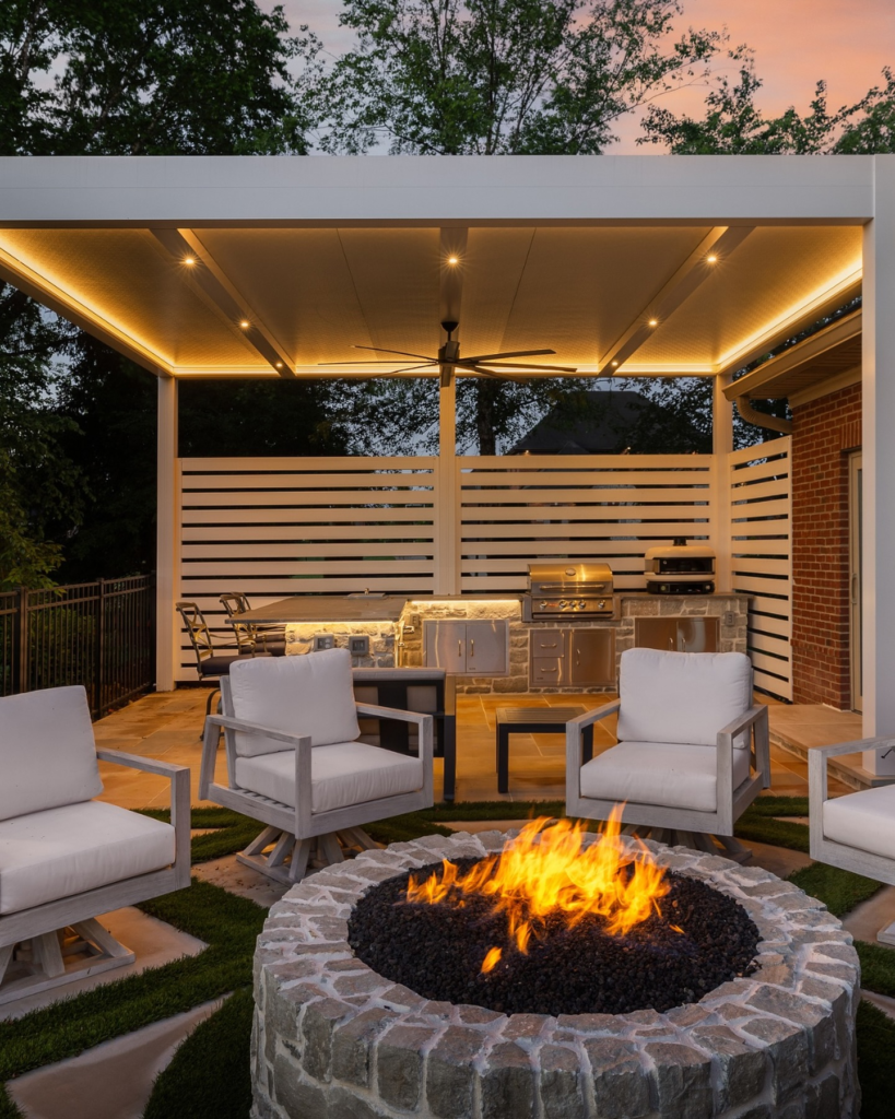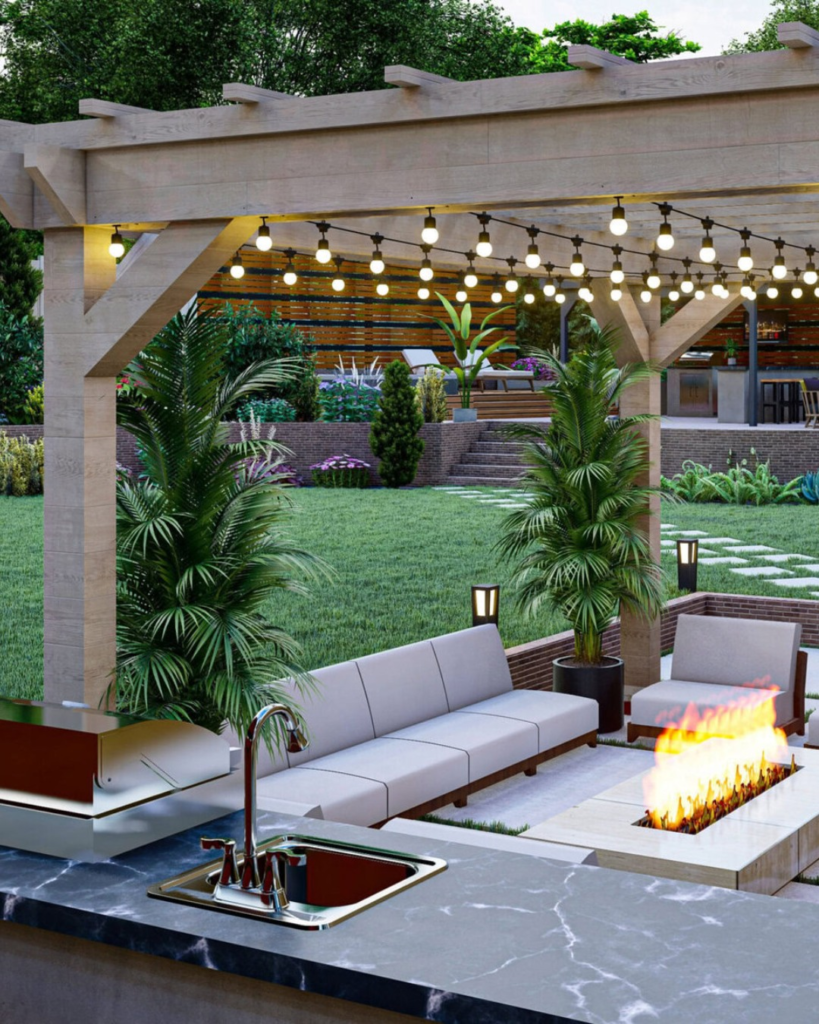 Who doesn’t love a fire pit? Combine one with comfy lounge seating under your pergola.