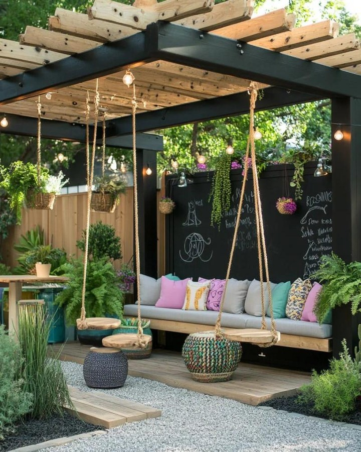 Who says pergolas are just for seating and dining? A swing hanging from the beams adds a playful, nostalgic touch.
