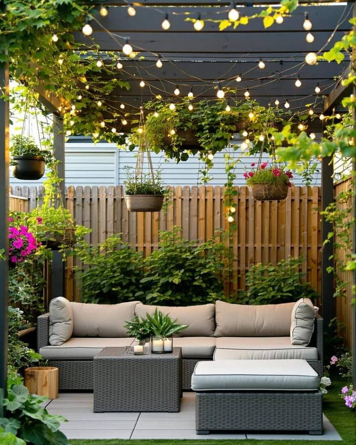 Opt for cedar or redwood they’re not only beautiful but also naturally resistant to the elements. Pair it with comfy outdoor furniture and fairy lights, and you’ve got yourself a cozy retreat.