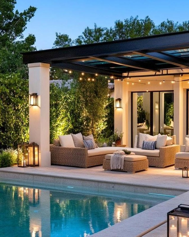 For a rustic or vintage touch, hang lanterns from the beams. They cast soft, enchanting light that transforms your patio into an outdoor sanctuary when the sun goes down. Bonus points if you mix battery-powered and candle-lit lanterns.