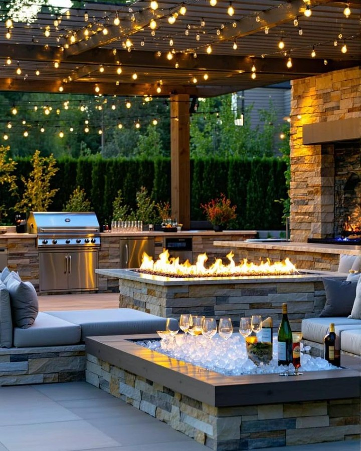 Now, this one’s for the serious entertainers. An outdoor fireplace under your pergola creates a cozy focal point and extends your patio season into chilly evenings. Imagine sipping cocoa or wine by the fire it’s pure bliss.