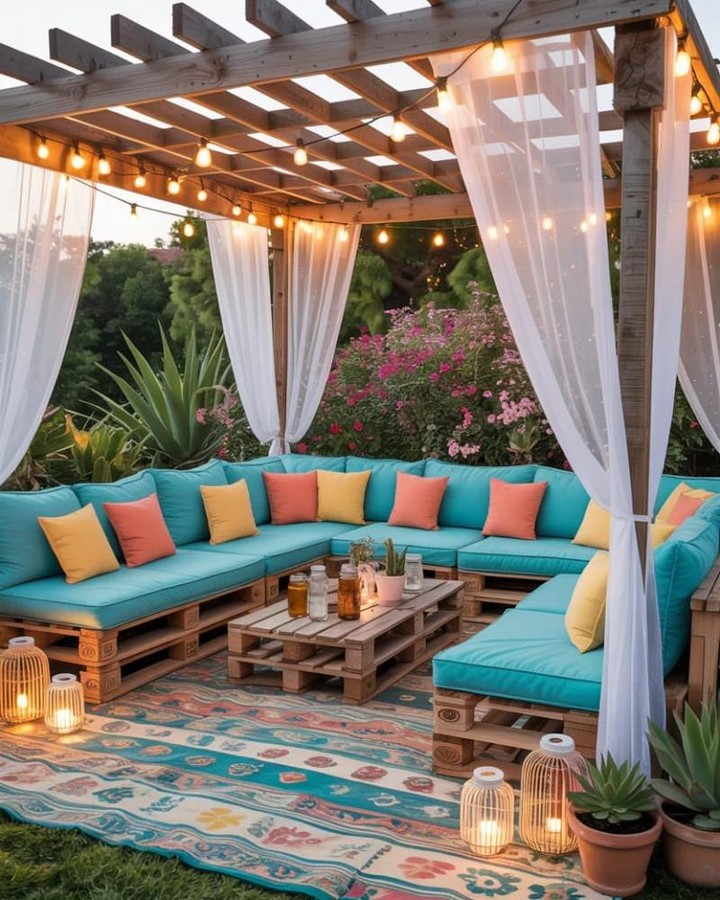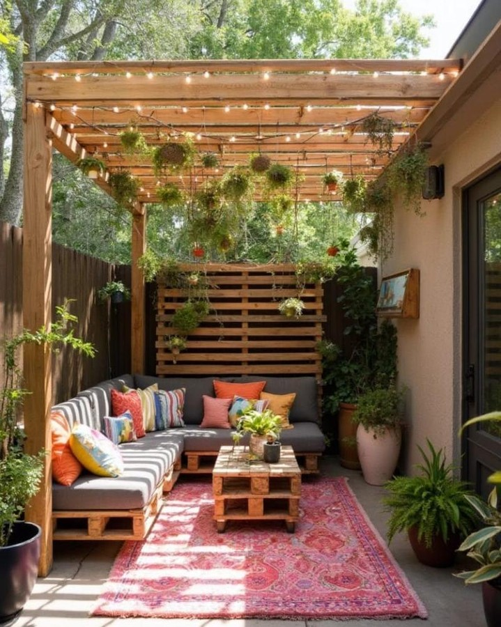 Outdoor rugs add comfort and define your space. Pick a pattern or color that complements your furniture and pergola style.
