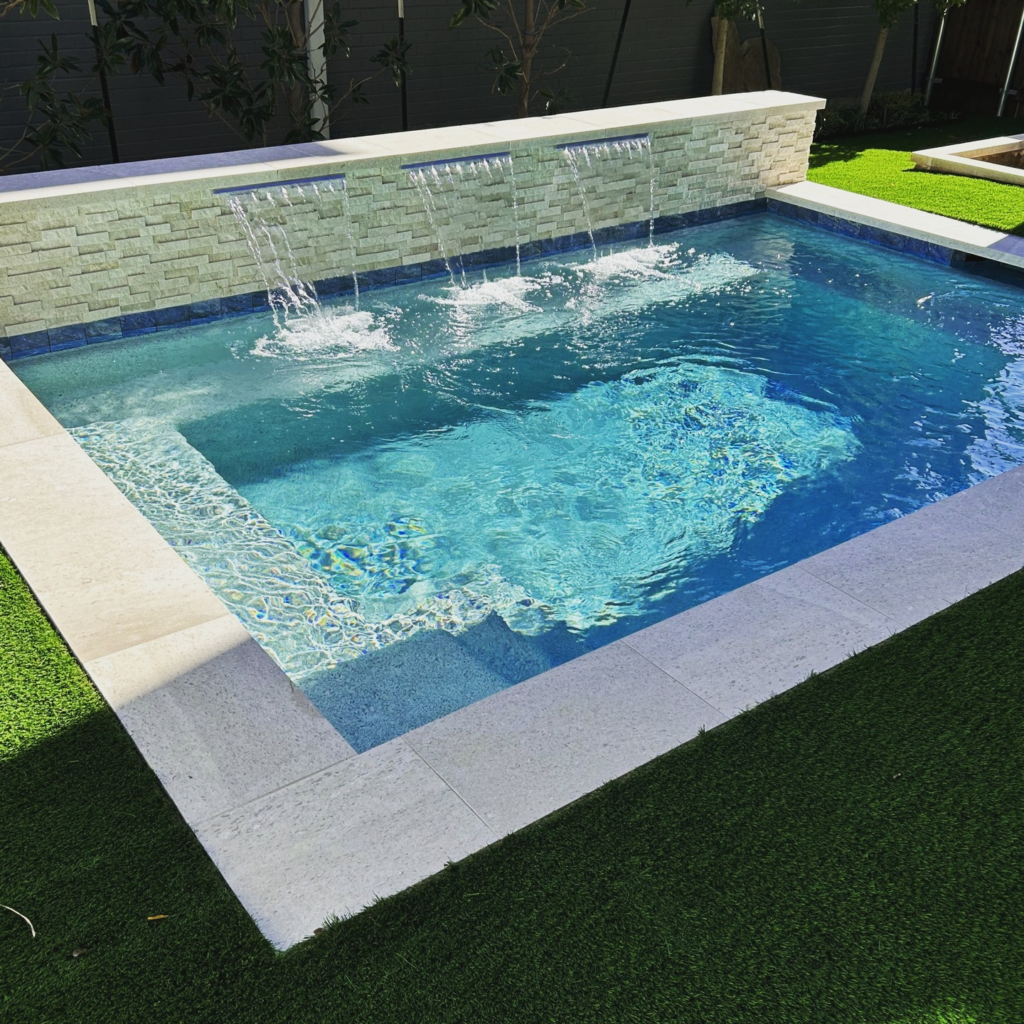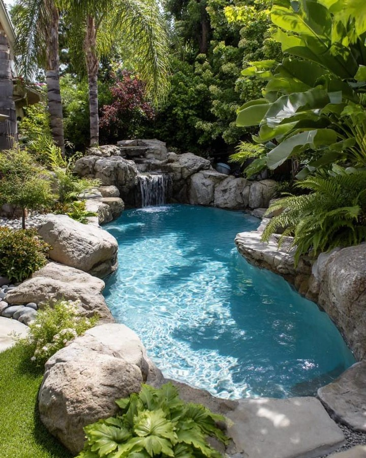 Even a tiny pool can have a waterfall. A cascading wall or corner waterfall brings soothing sounds and a spa-like experience. Pair it with rocks or mosaic tiles for a natural, luxurious look.